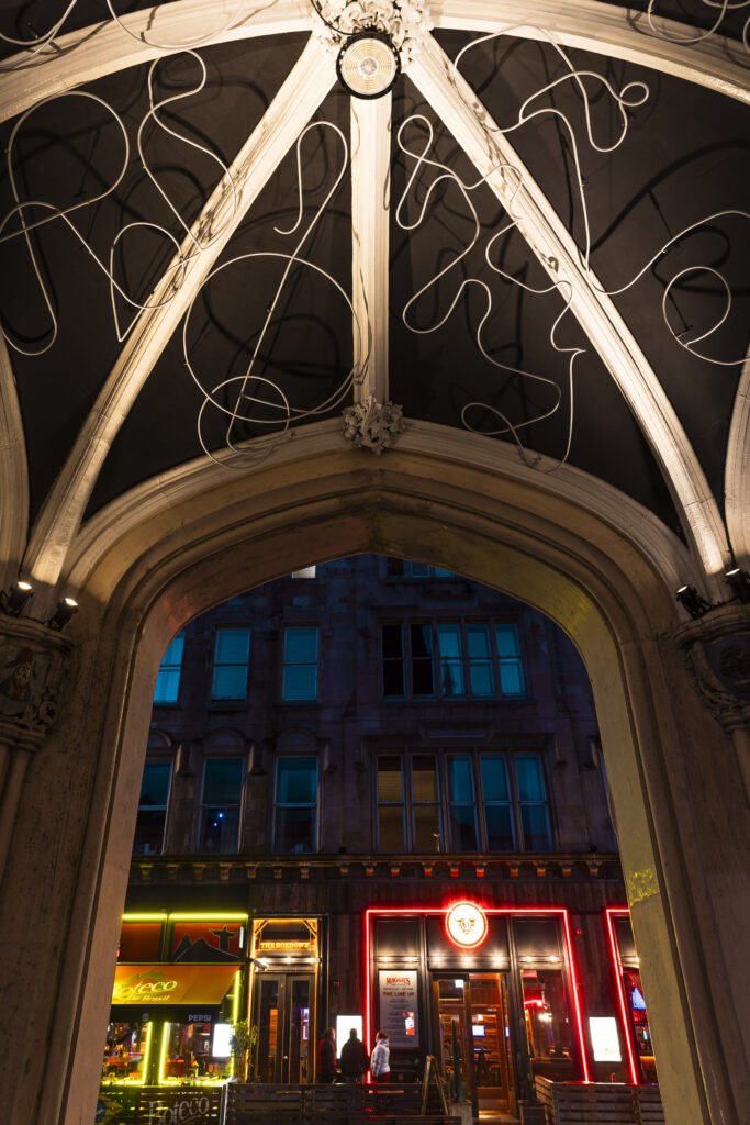The Tron commissioned artist Kayleigh McGuiness to install a sculpture under the archway of the steeple, inspired by the history of the building. In tandem, Sergey Jakovsky of Sharmanka Kinetic Theatre has restored the extraordinary moving sculpture of St Mungo on the west side of the steeple.